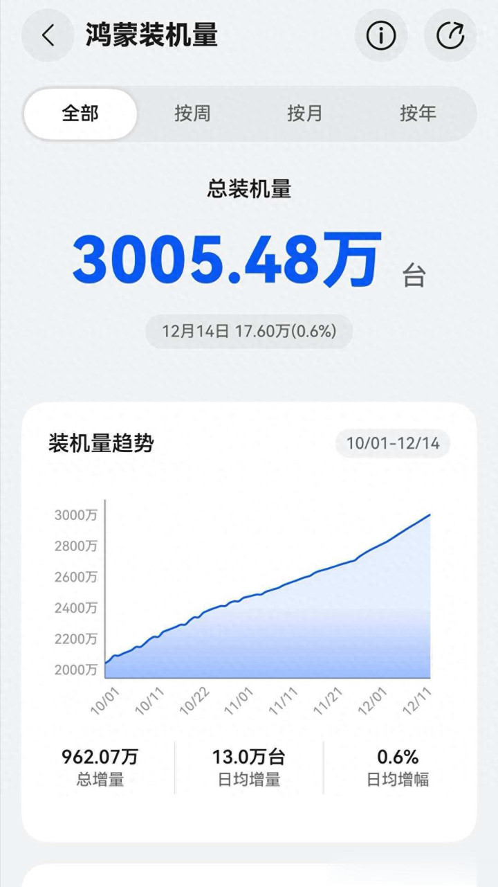 2025 年 12 月15日消息全国股票配资,鸿蒙操作系统装机量(HarmonyOS 5及后续新版本)正式突破 3000万大关,达到3005.48万。