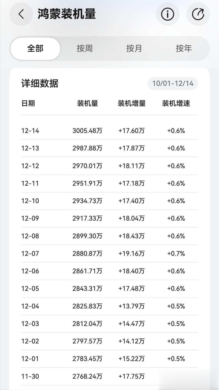 自11月28日 Mate80 系列发布以来,鸿蒙操作系统装机量加速上升,日均新增装机量17万+,12月份已累积新增设备200万+。