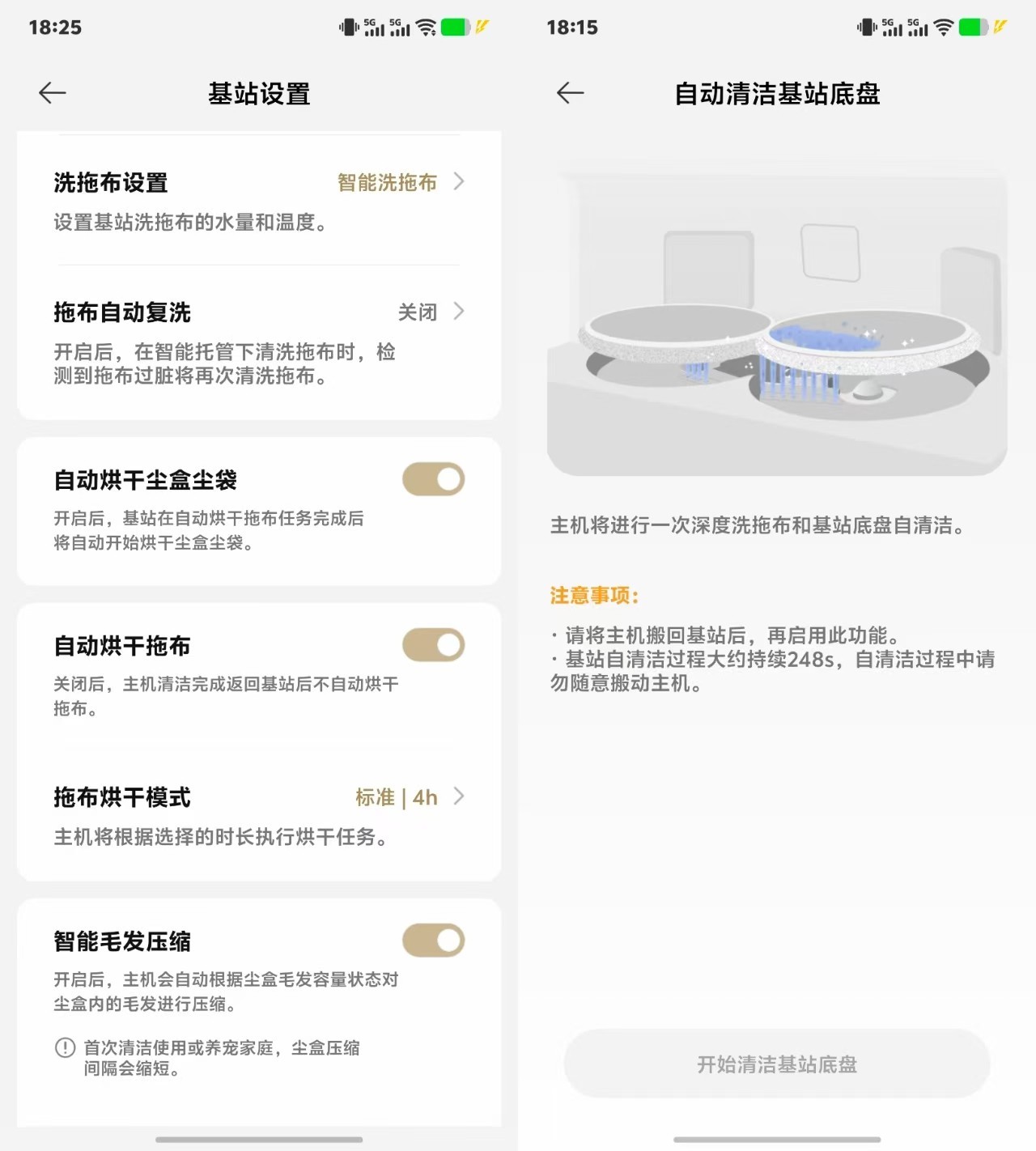 而在App当中,你还能找到大量的基站设置,涉及清洁液加注、拖布清洗和烘干、集尘袋(含毛发压缩等),以及自动深度底盘清洁。一般情况下,基站底盘自清洁不需要频繁使用,但当主机进行过强度较高的清洁之后,建议是启动一次底盘自清洁。