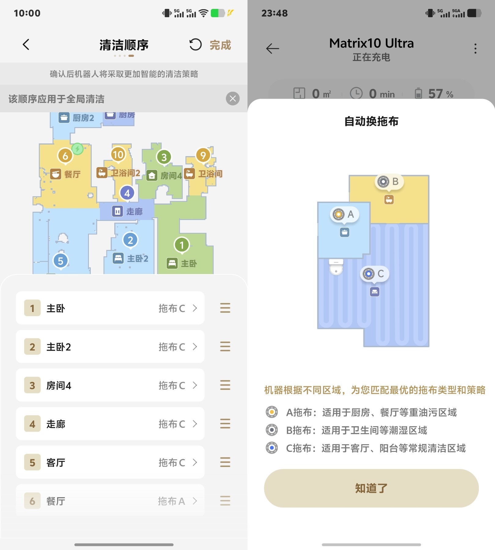 落到具体的体验上,Matrix10 Ultra在建图的同时会根据画面识别进行智能分区,初步判断空间组成,并为其匹配拖布和清洁顺序。如果没有特殊需求,小雷个人认为系统根据建图智能匹配的拖布配置和清洁步骤已经足够。当然,如果你有需求,后续也能自己调整情节顺序和拖布配置,自由度相当高。