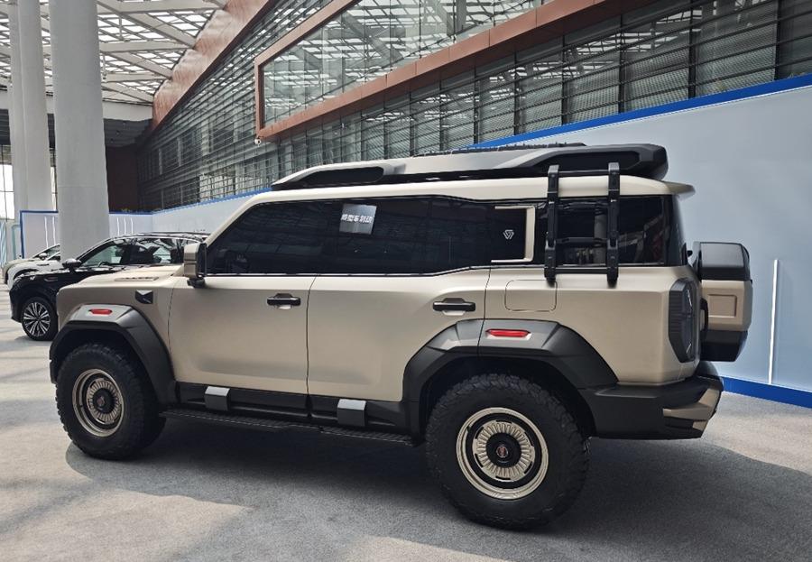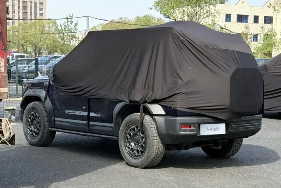 车身侧面部分,透过外围覆盖的车衣,还是可以比较直观的看出其侧颜整体的魁梧与硬朗。并且,向外凸起的前后轮眉与侧裙,结合类似植入了“铆钉”样式的镂空大尺寸轮毂与全地形AT轮胎,可进一步推动其外观整体的硬派野性气息。此外,新车作为一款中大型SUV定位的产品,将具备5135/2050/1950mm的车身三围以及2900mm的轴距,并采用了非承载式车身结构。